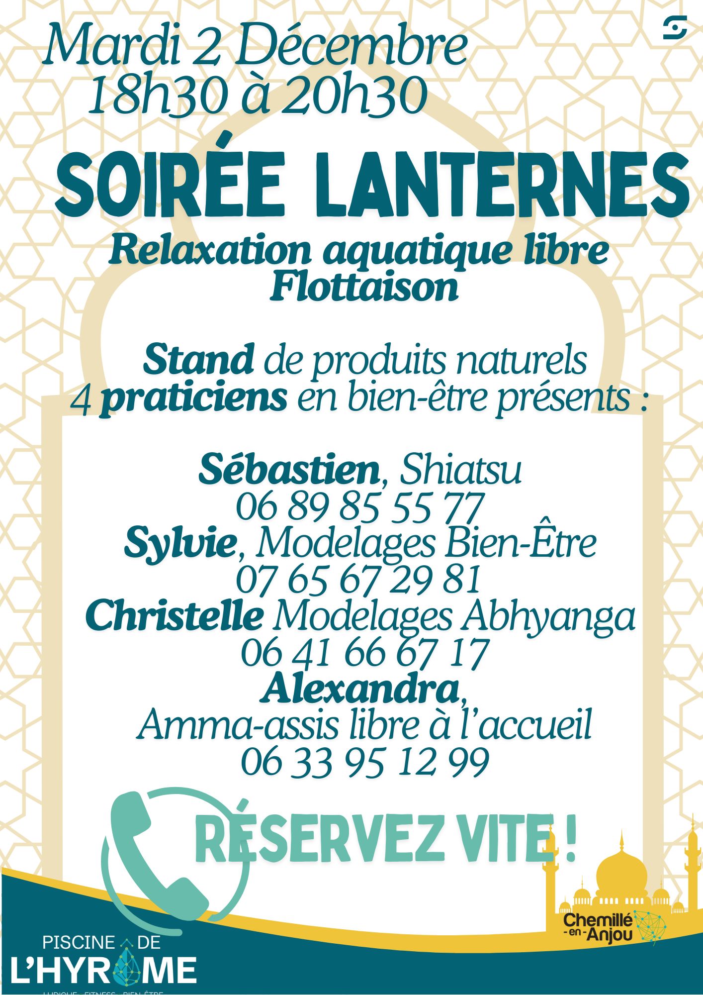 Le premier Mardi de chaque mois Événement mensuel de 18h30 à 20h30 Soins proposés Réservation à l'accueil